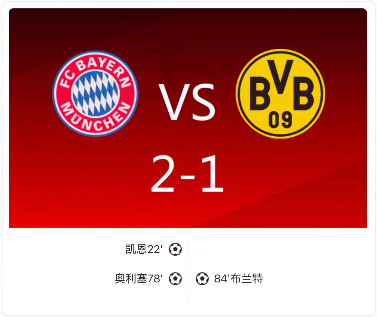 比赛伊始,拜仁便展现出强大的统治力,上半时几乎完全掌控了比赛节奏。奥利塞与迪亚斯在前场不断制造威胁,让多特的防线风声鹤唳。第22分钟,凯恩抓住机会打破僵局,为拜仁取得领先。下半时多特虽调整战术,进攻有所起色,吉拉西与阿德耶米也创造出一些机会,但均未能转化为进球。直到第78分钟,奥利塞挺身而出,扩大领先优势,几乎为拜仁锁定胜局。第84分钟,布兰特为多特扳回一城,但为时已晚。最终,拜仁凭借更高效的进攻和稳固的防守,赢得了这场关键战役。