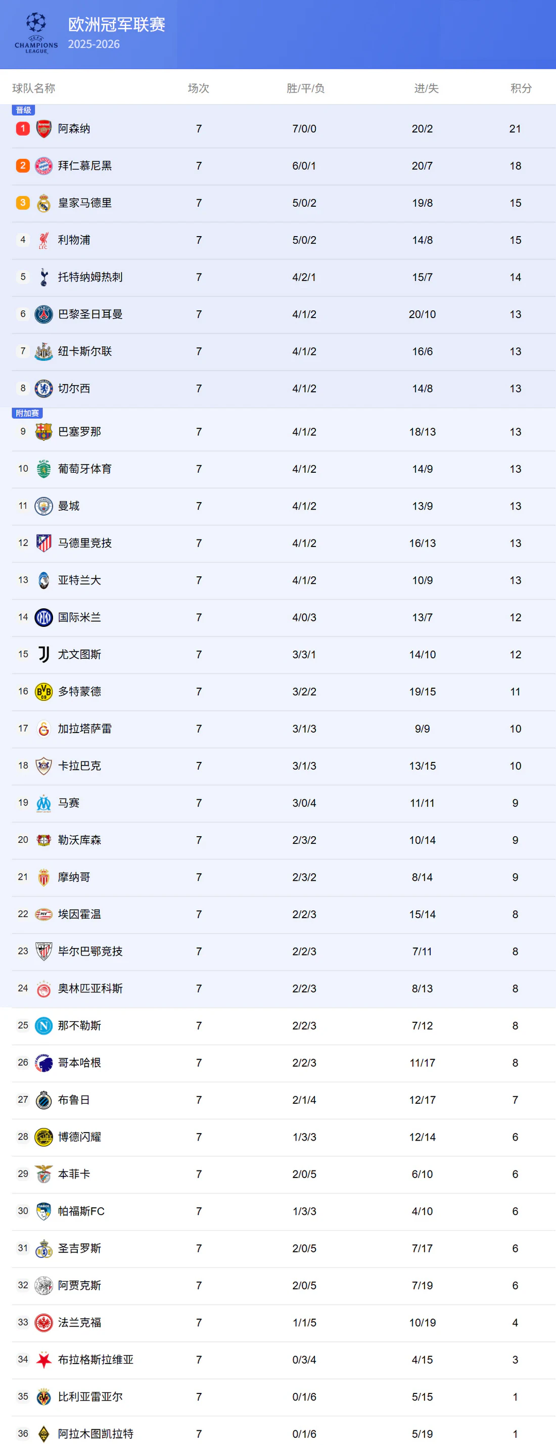 具体来看,阿森纳以出色的表现高居榜首,利物浦位列第四,热刺、纽卡斯尔和切尔西分别排在第五、第七和第八位。这五支英超球队已经提前锁定晋级16强的名额,展现了英超在欧洲赛场的强大竞争力。
