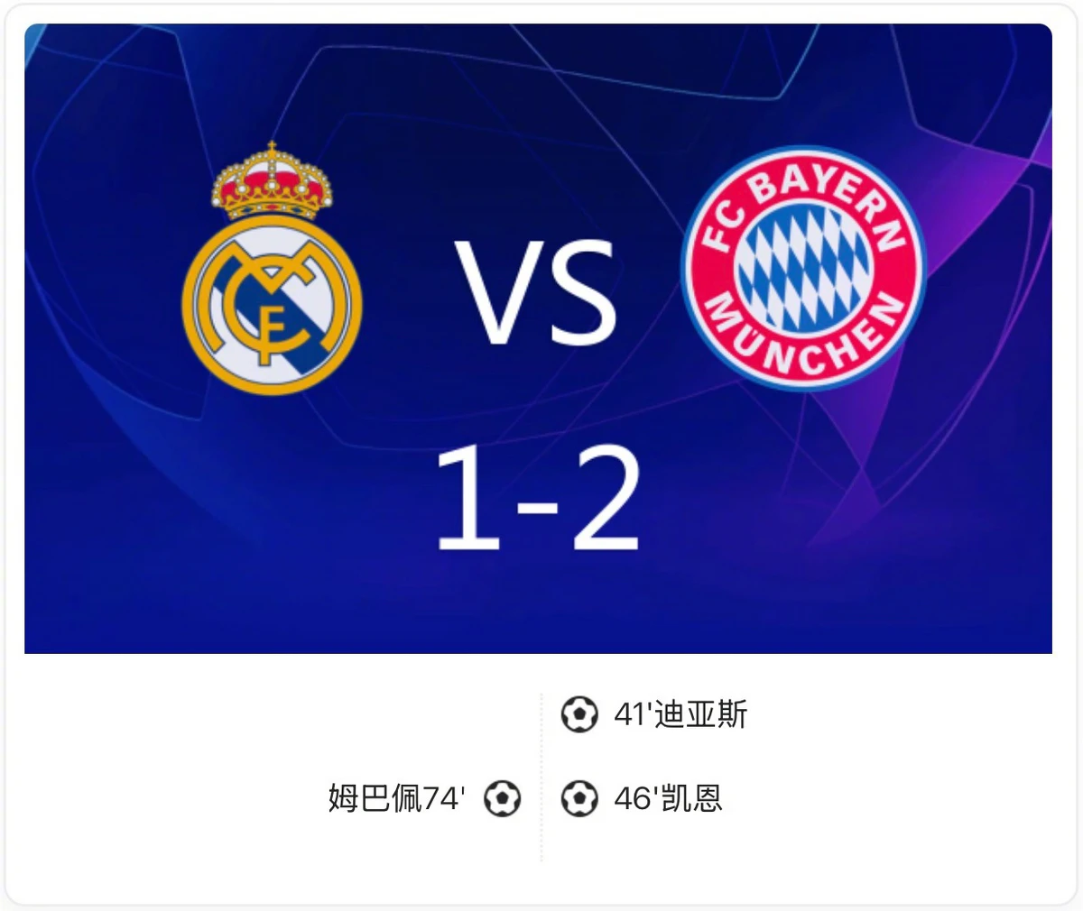 本场比赛从开场便进入高速攻防节奏。第41分钟,皇马防线率先出错——维尼修斯中场传球漫不经心被断,拜仁迅速发动反击,格纳布里送出手术刀直塞,路易斯·迪亚斯推射远角破门,拜仁1-0领先。