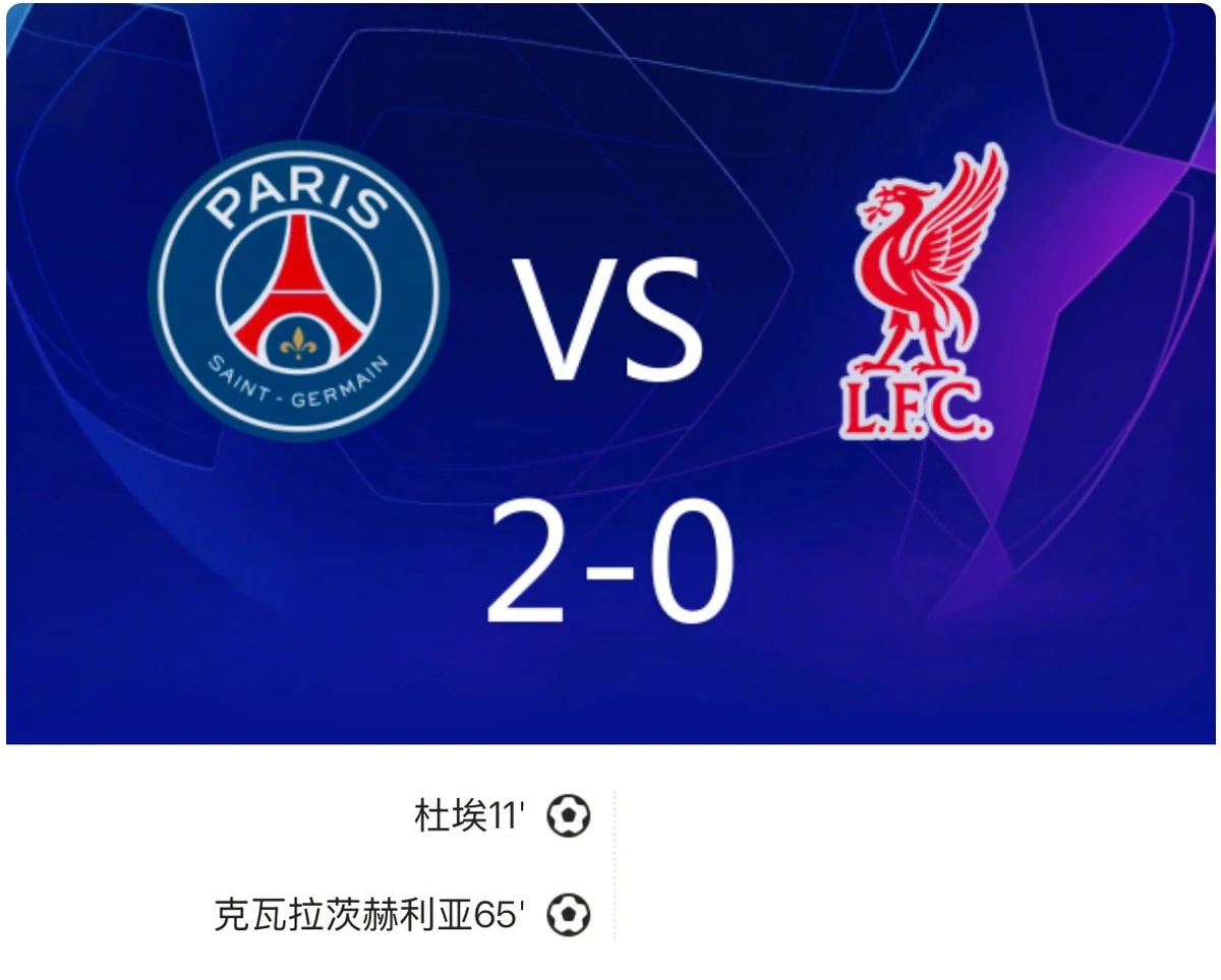上半场巴黎多次制造威胁,第37分钟门德斯横敲,杜埃跟进推射被利物浦门将马马尔达什维利扑出;第42分钟,杜埃横敲,登贝莱跟进打门再次被门将化解。