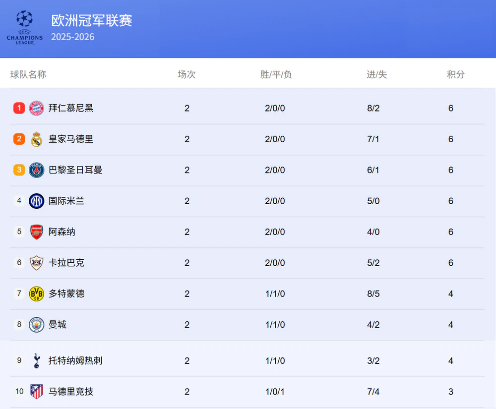 - 拜仁慕尼黑、皇家马德里、巴黎圣日耳曼、国际米兰和阿森纳这五支豪门球队均取得两连胜,积6分领跑积分榜。其中,拜仁客场5-1大胜帕福斯,皇马客场5-0横扫阿拉木图凯拉特,巴黎在客场2-1绝杀巴萨,国米主场3-0完胜布拉格斯拉维亚,阿森纳主场2-0击败奥林匹亚科斯。