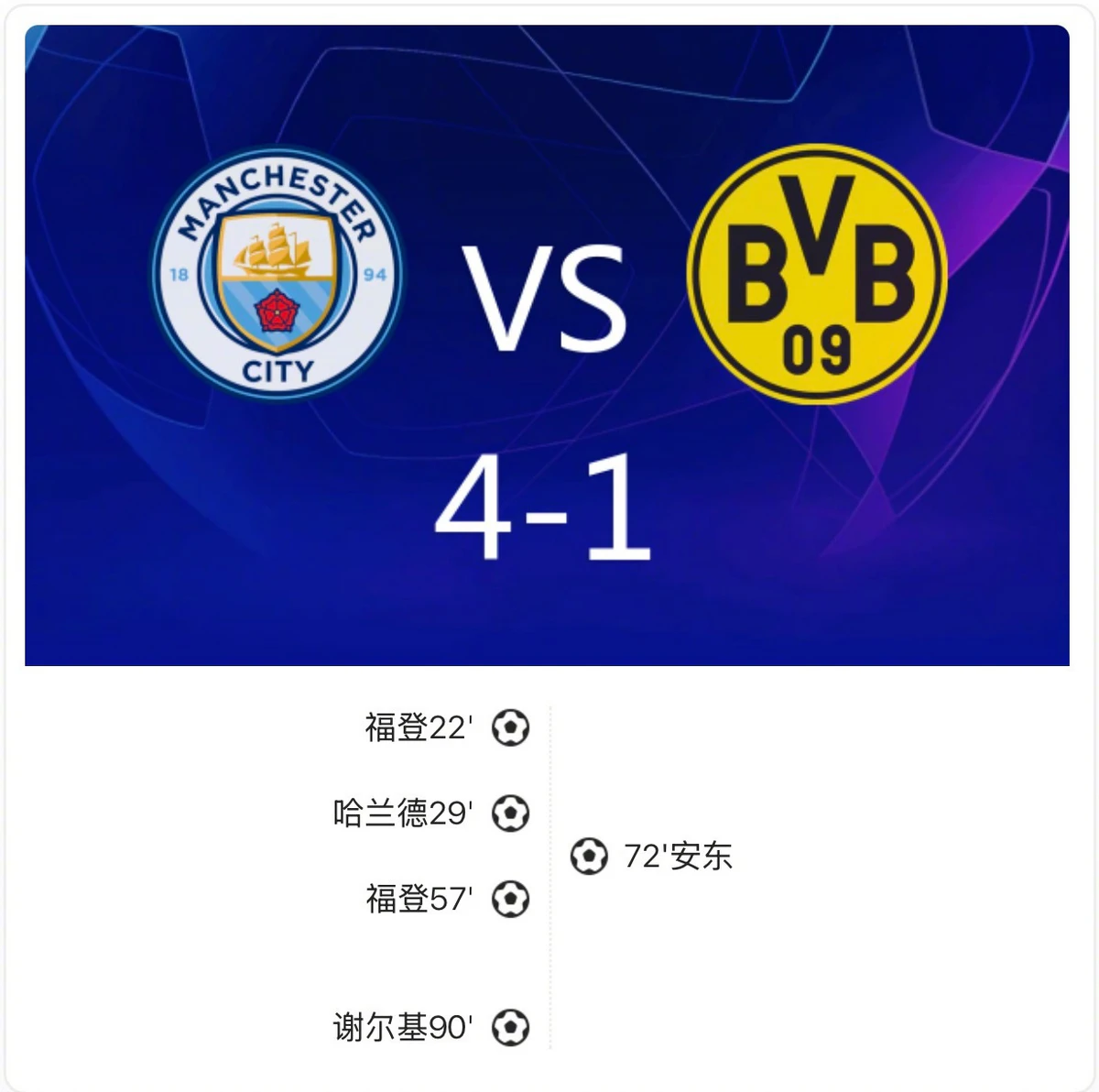 下半场易边再战,曼城的进攻火力依旧猛烈。第57分钟,福登再次发威,他在禁区线上兜射远角,皮球擦着立柱入网,完成梅开二度,将比分改写为3-0。尽管多特蒙德在第72分钟由安东扳回一球,但伤停补时阶段,替补登场的谢尔基再入一球,将全场比分定格为4-1。