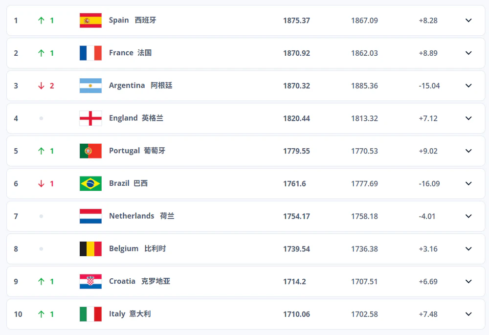 从欧洲杯到世界之巅,西班牙只用两场横扫完成加冕 最秀网 2025-09-18热评 220 北京时间9月18日,国际足联公布新一期男足世界排名。凭借世预赛 3-0、6-0 双杀保加利亚与土耳其的强势表现,欧洲杯冠军西班牙上涨1位,以1875.37分自 2022年12月以来重夺世界第一;法国同步上升1位至第二,阿根廷因 0-1不敌厄瓜多尔下滑 2 位,29 个月来首次掉出前二。 前十位 西班牙 法国 阿根廷 英格兰 葡萄牙 巴西 荷兰 比利时 克罗地亚 意大利 亚洲方面,日本仍列第19领跑亚足联,中国男足无赛任务,继续位居第 94、亚洲第 14。 fifa FIFA世界排名 本文由@最秀网原创发布。如果文章中的内容侵犯了您的版权和利益,请联系我们!感谢支持 如若转载,请注明出处:http://www.zuixiu.cn/xinwen/reping/357.html THE END