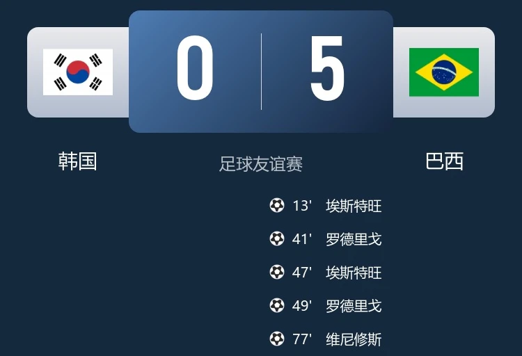 比赛开始后,巴西队就展现出了强大的实力和出色的进攻能力。他们在场上占据了绝对的优势,不断向韩国队的球门发起猛烈的进攻。维尼修斯传射,罗德里戈、埃斯特旺均梅开二度。