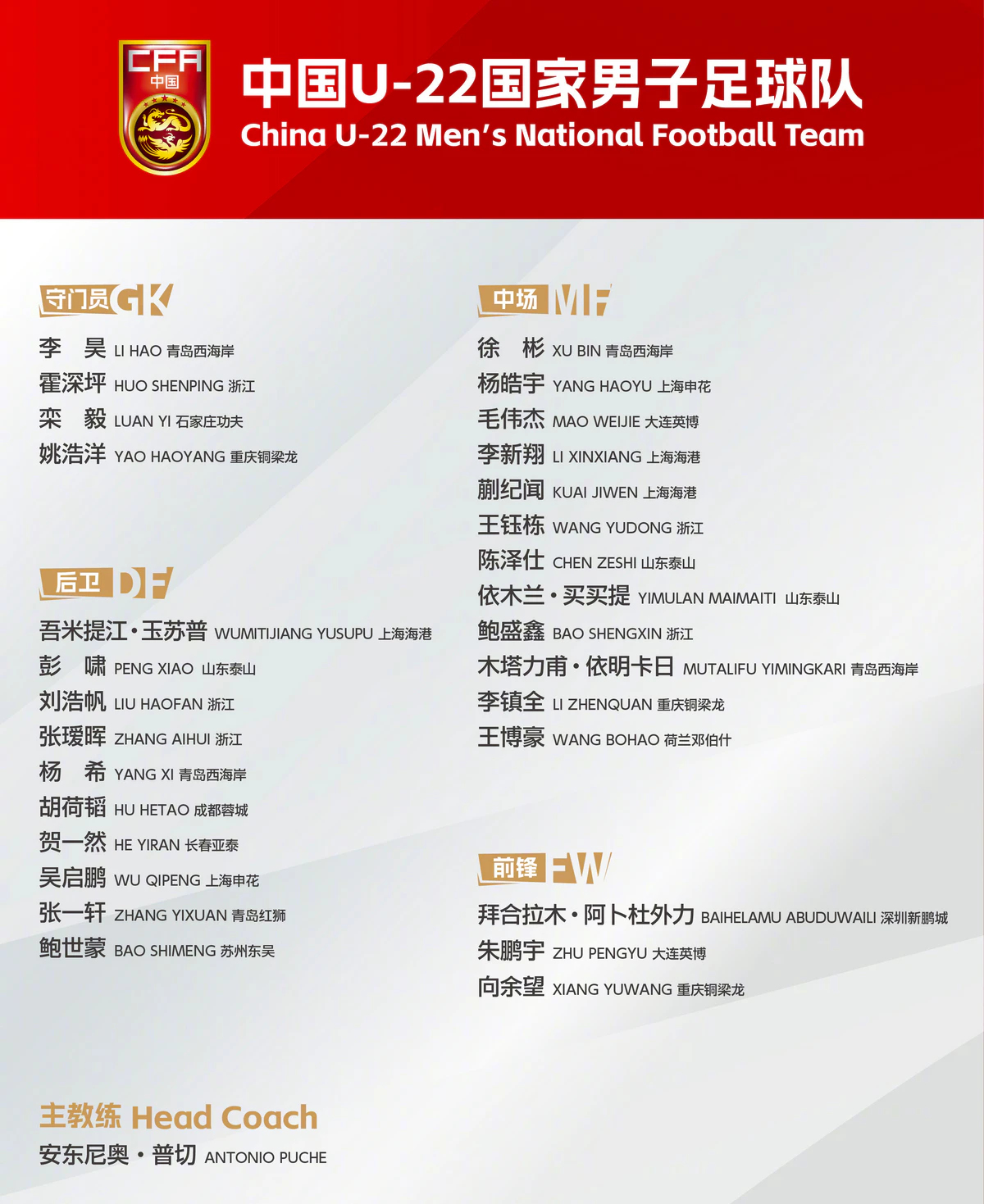 徐彬(青岛西海岸)、杨皓宇(上海申花)、毛伟杰(大连英博)、李新翔(上海海港)、蒯纪闻(上海海港)、王钰栋(浙江)、陈泽仕(山东泰山)、依木兰・买买提(山东泰山)、鲍盛鑫(浙江)、木塔力甫・依明卡日(青岛西海岸)、李镇全(重庆铜梁龙)、王博豪(荷兰邓伯什);