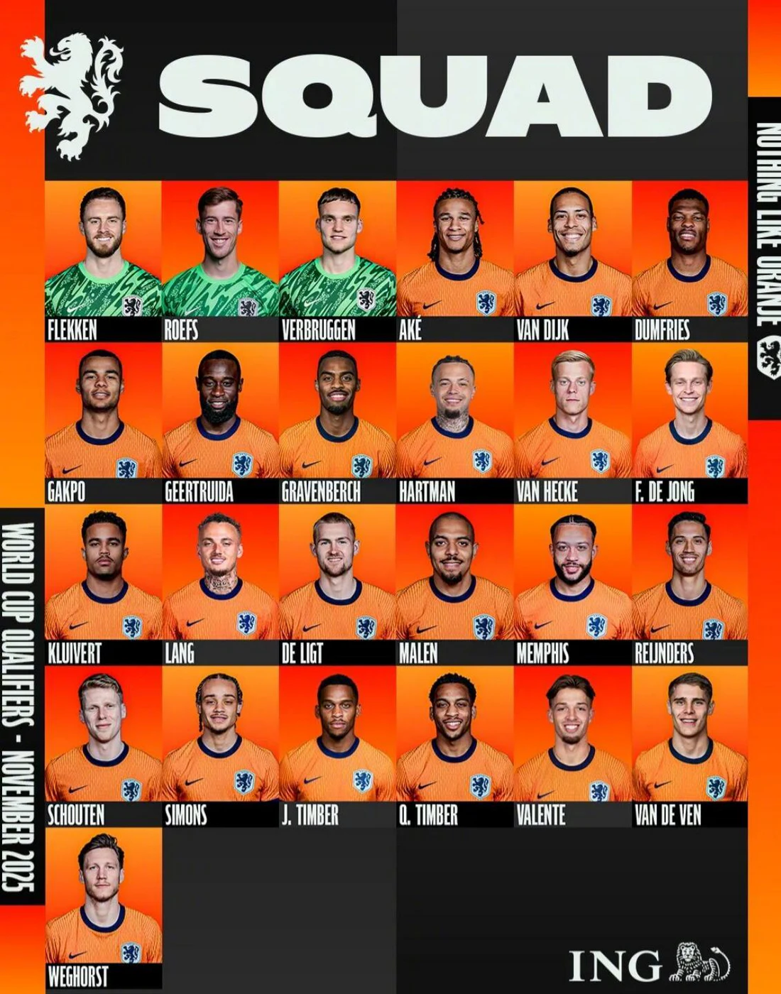 门将:弗莱肯(勒沃库森),罗埃夫斯(桑德兰),维尔布鲁根(布莱顿)后卫:阿克(曼城),范戴克(利物浦),邓弗里斯(国际米兰),海特勒伊达(桑德兰),哈特曼(伯恩利),德里赫特(曼联),廷贝尔(阿森纳),范德芬(热刺),范黑克(布莱顿)