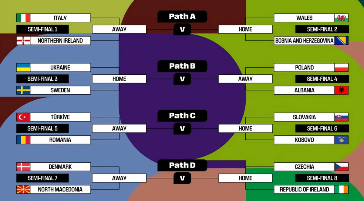 半决赛:捷克vs爱尔兰,胜者为决赛主队 ;丹麦vs北马其顿,胜者为决赛客队。半决赛中的种子队(FIFA排名靠前的8支球队)主场作战。半决赛将于2026年3月26日进行,决赛将于2026年3月31日进行