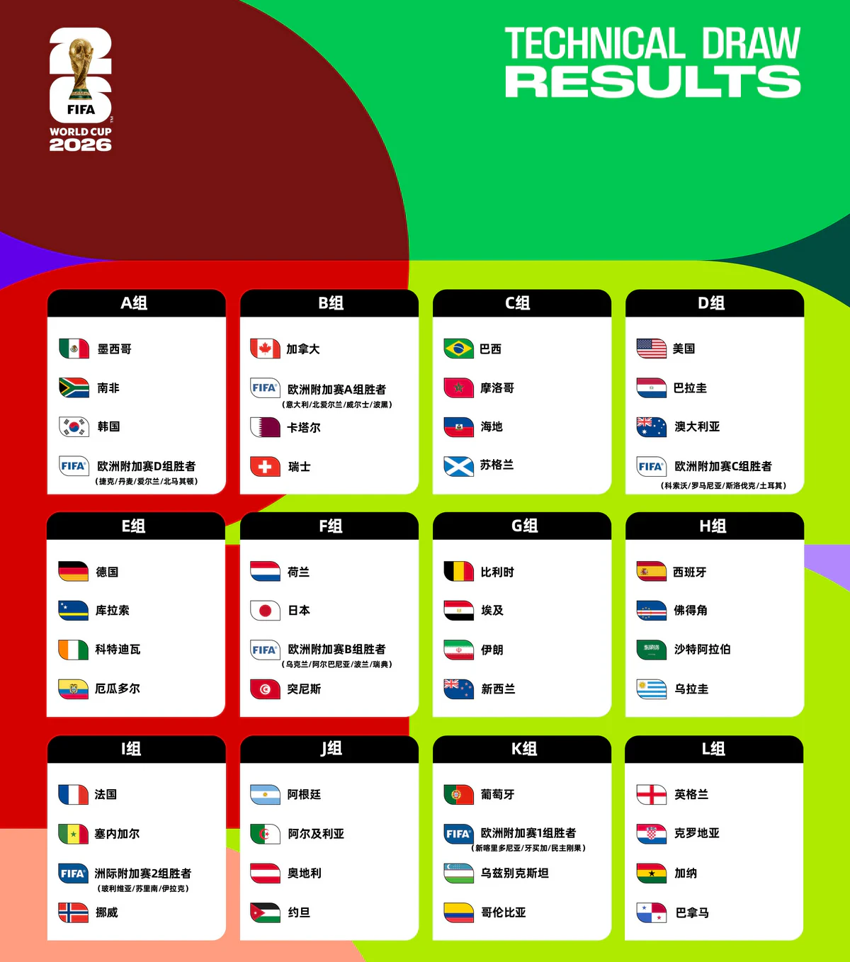 - I组:法国、塞内加尔、洲际附加赛胜者2(伊拉克/玻利维亚/苏里南)、挪威