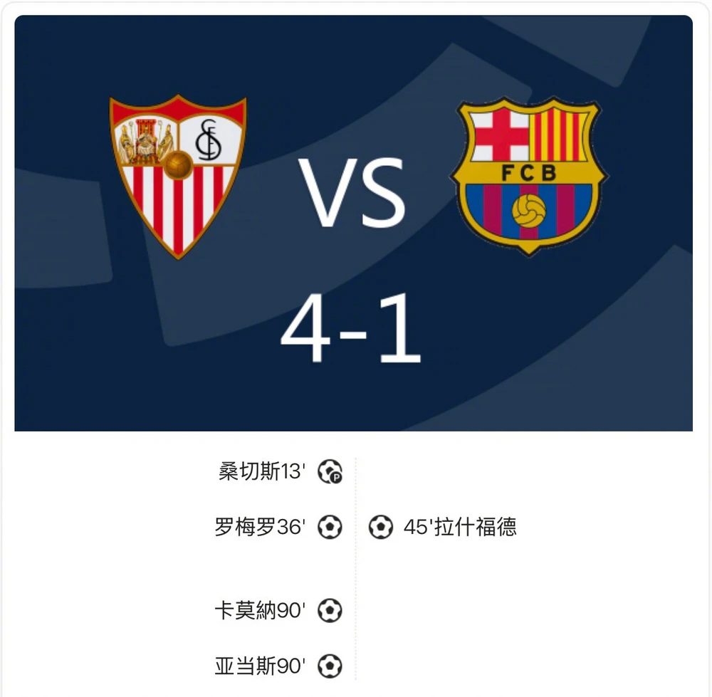 易边再战,第74分钟,巴萨获得点球机会,但莱万主罚偏出球门,错失扳平比分的良机。第90分钟,何塞·安赫尔禁区右侧低射破门,塞维利亚3比1领先。补时阶段,阿科·亚当斯推射破门,将比分锁定为4比1。