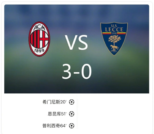 易边再战,下半场第51分钟,萨勒马克尔斯传中到后点,恩昆库凌空侧勾破门,斩获米兰生涯处子球。第64分钟,福法纳右路传中,普利西奇包抄凌空垫射得手,为米兰锁定胜局。最终AC米兰3-0完胜十人莱切,顺利晋级意大利杯16强,同时取得各赛事4连胜。