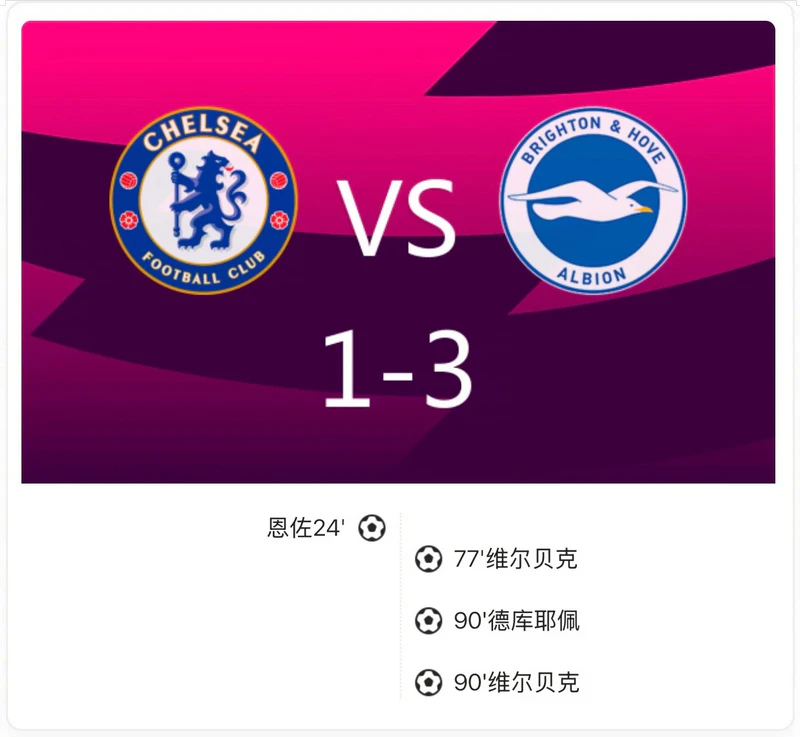 比赛开始后,切尔西占据主动,恩佐·费尔南德斯在第24分钟头球破门,帮助球队取得领先。然而,转折点出现在下半场,特雷沃·查洛巴在第53分钟被红牌罚下,切尔西不得不以十人应战。尽管如此,布莱顿在第77分钟由维尔贝克头球破门扳平比分。进入补时阶段,布莱顿的德克珀在第90+2分钟头球破门,帮助球队反超比分。而在第90+10分钟,维尔贝克再入一球,完成梅开二度,为布莱顿锁定胜局。