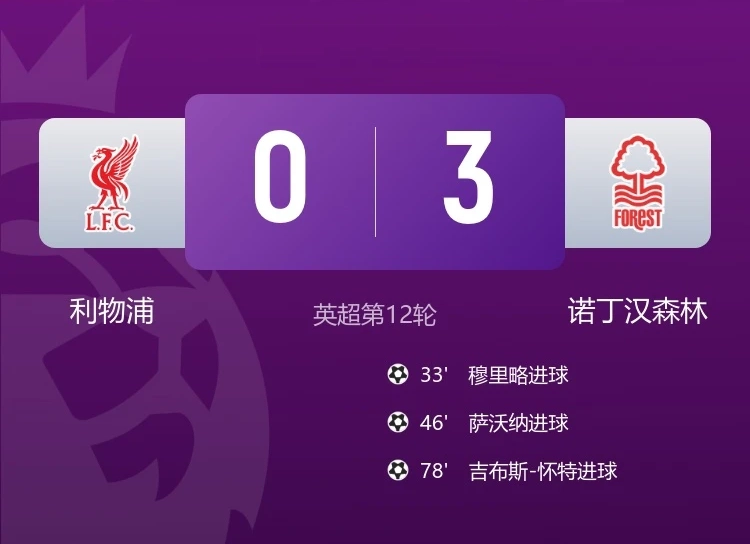 这场失利让利物浦创下了一系列耻辱纪录。这是他们自1965年4月以来,首次遭遇联赛连续两场净负3球的耻辱。同时,这也是红军队史英超主场并列最大分差失利,此前仅有2005-2006赛季1-4不敌切尔西、2015-2016赛季0-3不敌西汉姆联等少数惨案。此外,利物浦近7轮联赛输掉了6场比赛,失利场次相当于球队此前58场比赛的输球总和。诺丁汉森林的逆袭