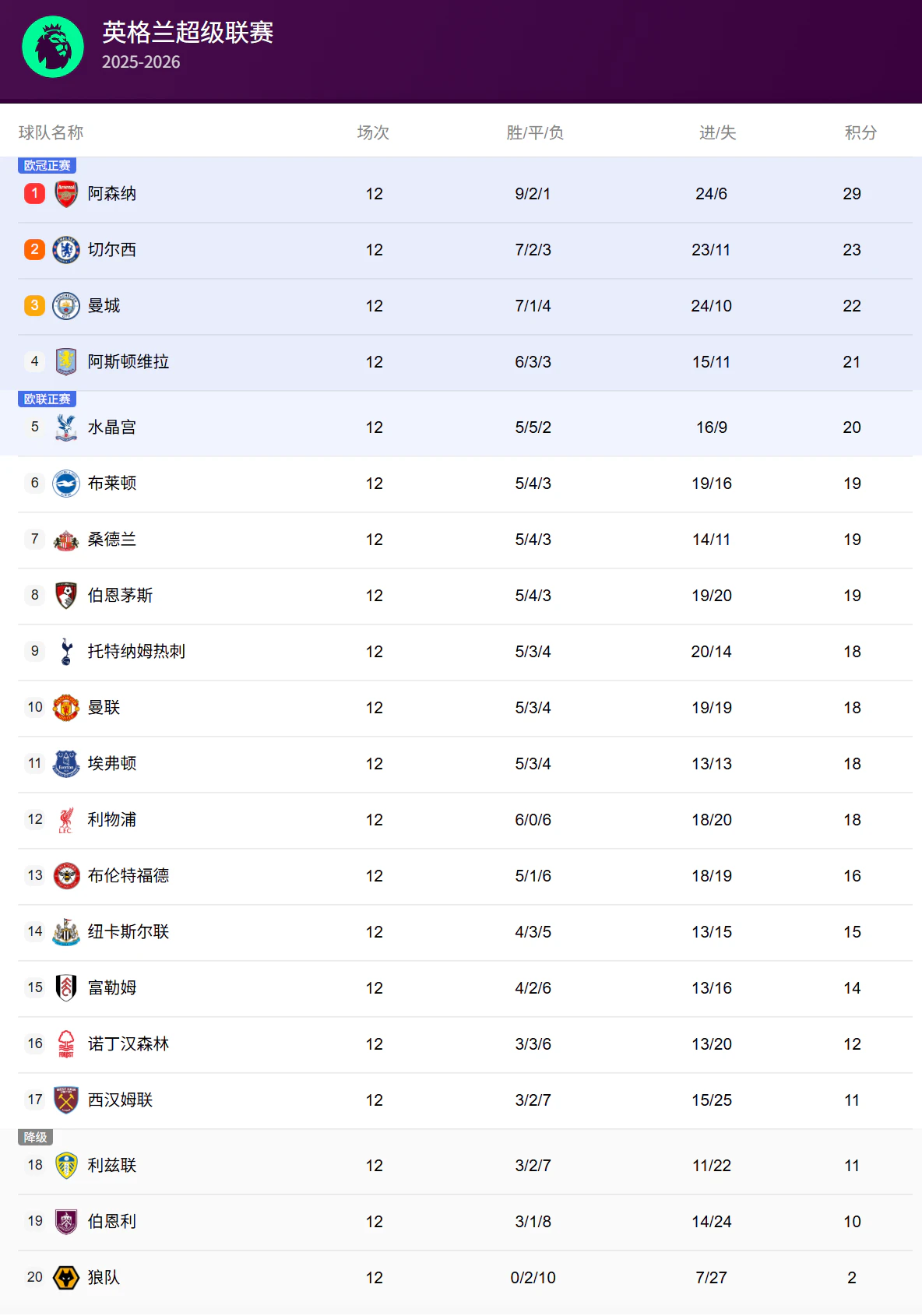 阿斯顿维拉本轮客场2-1战胜利兹联,迎来两连胜,以21分暂列第四。水晶宫以20分位列第五,布莱顿、桑德兰和伯恩茅斯都只落后水晶宫1分。从第二名切尔西到第十二名利物浦,这11支球队之间的总分差仅为5分,竞争异常激烈。