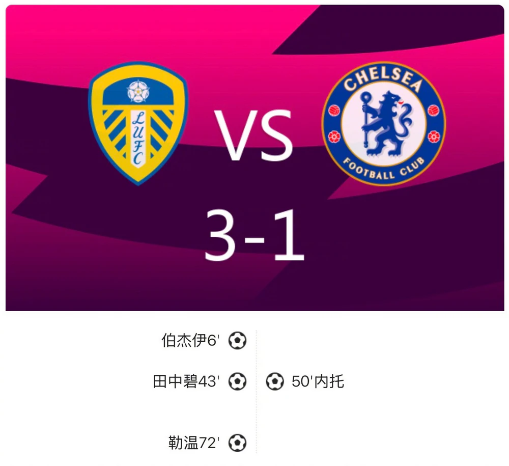 下半场易边再战,切尔西在第50分钟扳回一球。吉滕斯左路下底传中,内托球门后点停球,顺势左脚撩射破门。第72分钟,阿达拉比奥尤接球失误被利兹联抢断,桑切斯没有扑住皮球,皮球从身下漏出,勒温跟上轻松推射破门,利兹联将领先的优势扩大到了3-1。