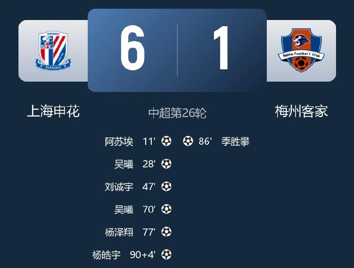 比赛伊始,申花便迅速进入状态。第11分钟,阿苏埃接高天意传球,突入禁区后劲射得手,为申花打破僵局。第28分钟,马纳法精准挑传,吴曦插上挑射远角破门,将比分扩大为2:0。下半场,申花攻势不减。第47分钟,阿苏埃再次建功,助攻刘诚宇破门,比分变为3:0。第70分钟,朱辰杰抢断后直塞,吴曦推射远角完成梅开二度。第77分钟,于汉超替补登场后不久便助攻杨泽翔推射破门,申花5:0领先。尽管梅州客家在第86分钟由季胜攀扳回一球,但补时阶段杨皓宇的进球最终将比分锁定在6:1。